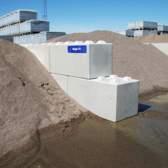 Detta är helblocksvarianten av flexiblock i naturgrå färg. På ovansidan av blocket finns gupp som gör att de efterliknar legobitar så man smidigt kan stapla blocken ovanpå varandra vid montering, samt snabbt tas ner eller flyttas på. Dessa kan användas som stödmur, brandskydd, motverka buller med mer. Alla flexiblock har injutna kulankare för att kunna lyftas smidigt.
